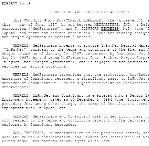 Toward the end of my wrongful termination suit I found the Scrushy-Findeiss contract The original House-Findeiss contract as it appeared in the MedPartners SEC filing. |