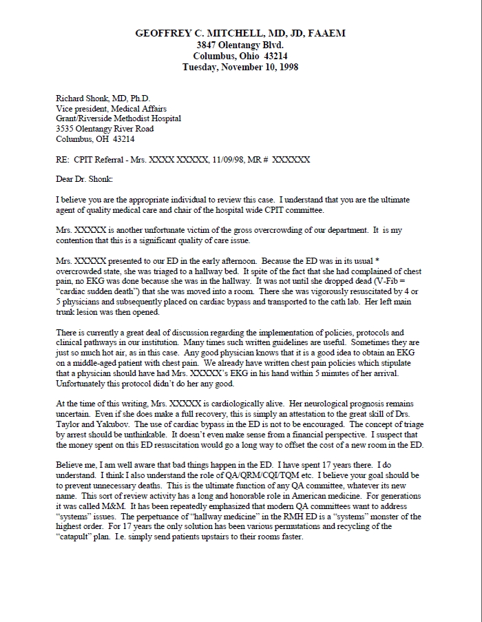 Hallway medicine came to a head in the fall of 1998. Under "hallway medicine" men got their shirts removed in public and had EKGs performed within the requisite five minutes. Women, for obvious reasons, did not. One woman had the worst sort of anterior myocardial infarction (MI) and was ignored in the hallway for about an hour. She then suffered a cardiac arrest and came as close to dying as is humanly possible. She was not my patient but I happened to have entered the emergency department and witnessed most of the event. She was rescussitated by placing her on cardiac bypass in the middle of the emergency department. I wrote a letter of concern to the hospitals director of quality assurance, Dr. Shonk. For that I was fired. |
